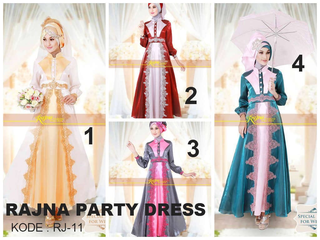 Produsen pertama adalah Rajna Party Dress. Konsep desain yang diusung oleh produsen yang satu ini sudah sangat tergambar dari merknya. Ya, mereka hadir di industri fashion muslim dengan menawarkan baju muslim bertemakan budaya India.