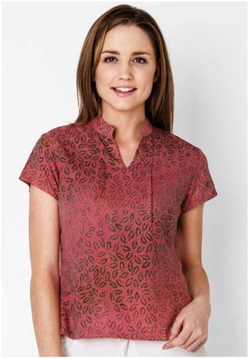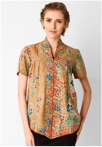 Meskipun baju di atas termasuk sebagai batik cap, namun penggunaan motif bunga-bunga berhasil menciptakan kesan yang sangat cantik. Apalagi dengan pemilihan warna cokelat yang dipadu dengan kerah berbentuk V, lengan pendek dan kancing pada bagian depannya.