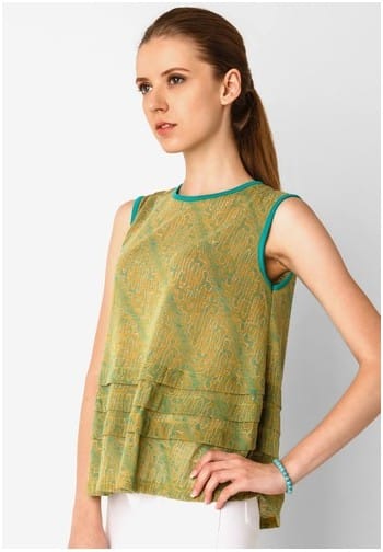 Katun menjadi pilihan utama untuk dijadikan bahan dari model baju yang satu ini. Kombinasi dari warna hijau dan emas membuatnya sangat cocok untuk digunakan oleh wanita yang memiliki kulit terang.